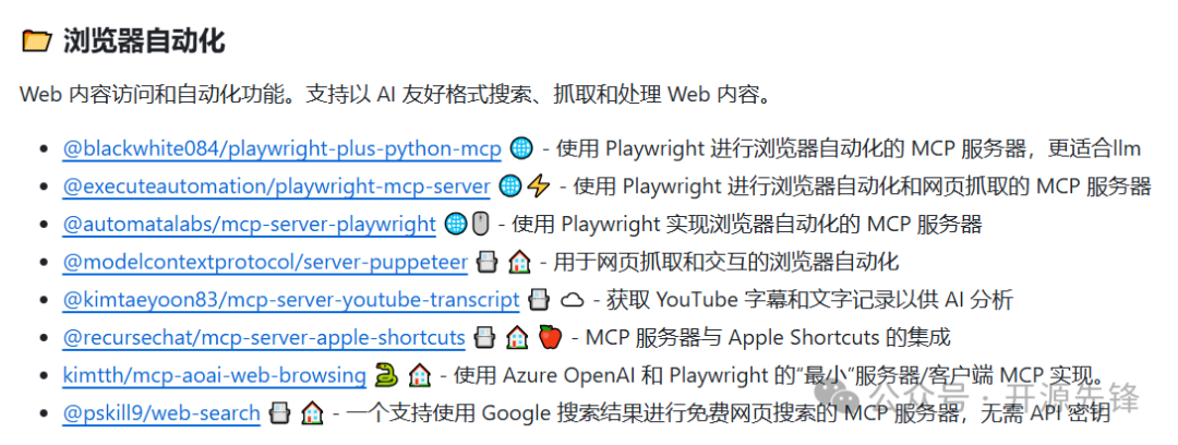 开源君分别试了几个服务器实现,感觉非常不错。比如,@executeautomation/playwright-mcp-server,这个服务器实现使用Playwright进行浏览器自动化和网页抓取,简直是AI模型的“眼睛”,让它们能够轻松访问和处理网页内容。