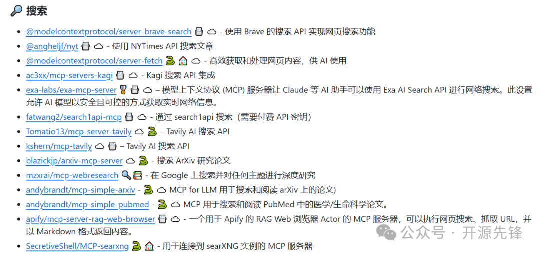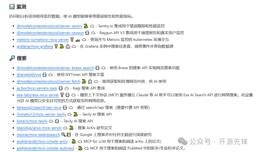 你只需要访问 GitHub 上找到这个项目的页面(awesome-mcp-servers)。根据你的需求,找到对应的服务器类别。比如你想让 AI 帮你实现一些自定义的搜索功能,那就去“搜索”类别里找找看。