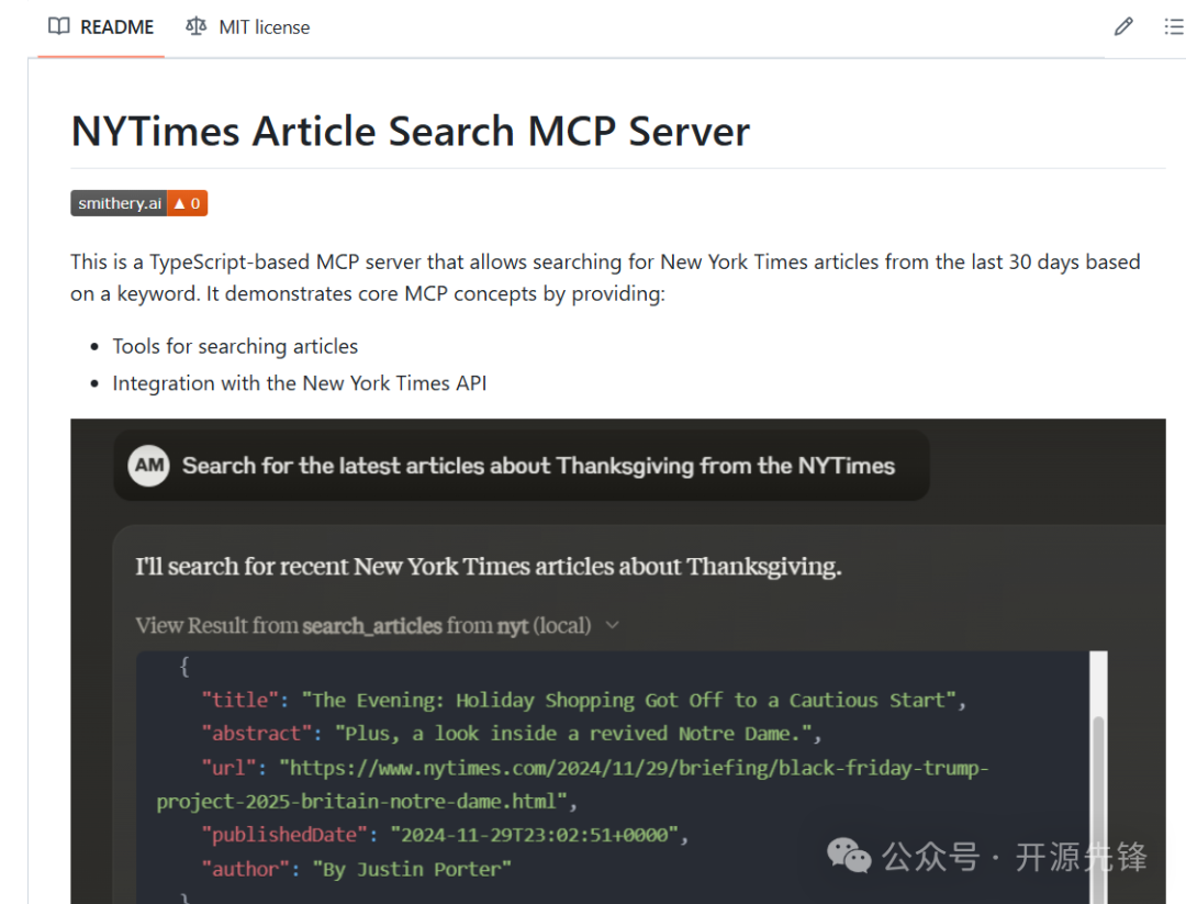 例如要是对@angheljf/nyt(使用 NYTimes API 搜索文章)感兴趣,直接点进去,按照它的说明进行配置和使用,就能让 AI 开始工作啦!是不是感觉就像给 AI 按了个“超级按钮”,让它瞬间拥有了超能力?